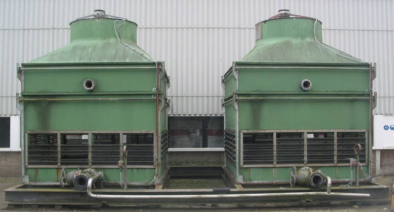 2 stuks Balcke koeltorens met afmetingen per cel: L x B = 3,2 x 3,2 m. De koeltorenconstructie geheel in polyester. Ventilatoraandrijving met motorreductor.