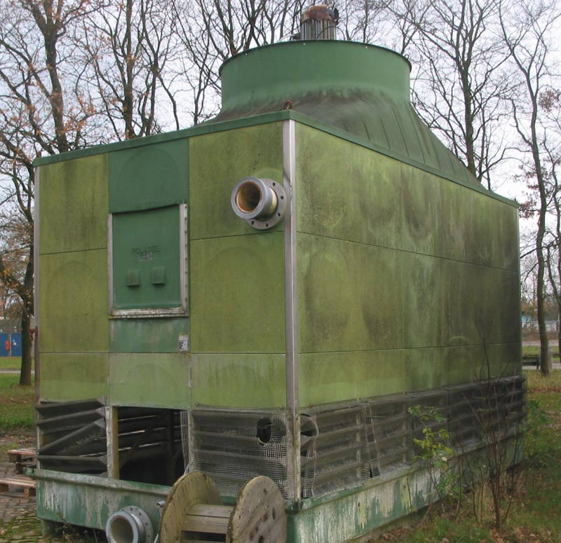Polacel koeltoren (zie foto) met afmetingen: L x B = 4,1 x 3,3 m. in polyester en RVS. Voorzien van een thermisch verzinkte trap met bordes. Ventilatoraandrijving met motorreductor.