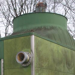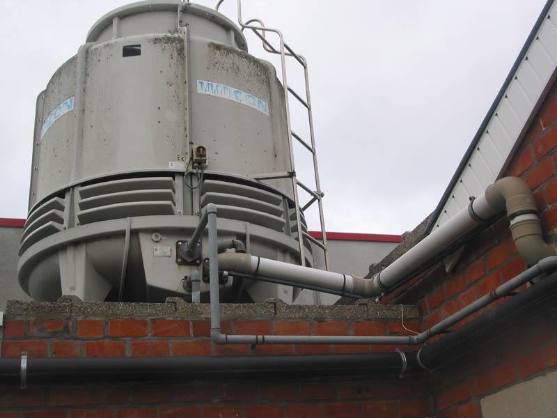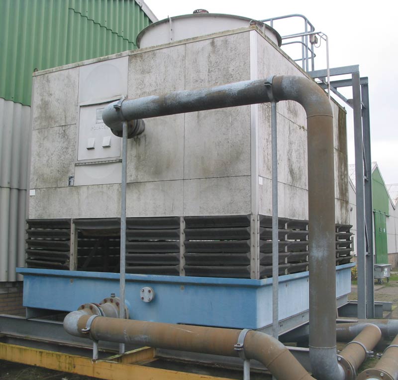 Polacel koeltoren (zie foto) met afmetingen: L x B = 4,1 x 3,3 m. in polyester en RVS. Voorzien van een thermisch verzinkte trap met bordes. Ventilatoraandrijving met motorreductor.