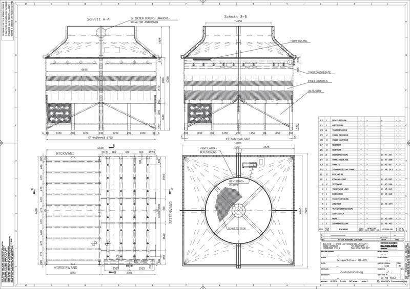 3 stuks Balcke koeltorens (kleur donkergrijs) met afmetingen per cel: L x B = ca. 7 x 7 m. (samengesteld uit 2 delen). De koeltorens zijn ieder voorzien van een eigen waterbassin in twee delen (niet op tekening). De koeltorenconstructie geheel in polyester. Ventilatoraandrijving met motorreductor. Inclusief: 4 stuks KSB koelwaterpompen, piping en schakelkasten.